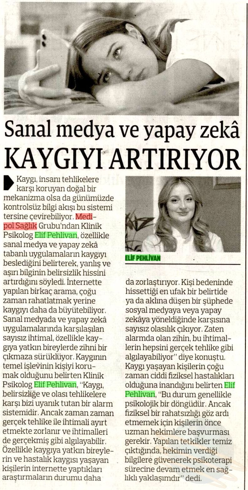 Kaygı, insanı tehlikelere karşı koruyan doğal bir mekanizma olsa da günümüzde kontrolsüz bilgi akışı bu sistemi tersine çevirebiliyor. Medipol Sağlık Grubu’ndan Klinik Psikolog Elif Pehlivan, özellikle sosyal medya ve yapay zeka tabanlı uygulamaların kaygıyı beslediğini belirterek, yanlış ve aşırı bilginin belirsizlik hissini artırdığını söyledi.