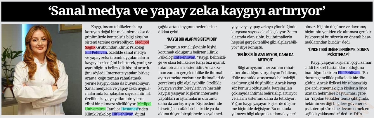 Kaygının temel işlevinin kişiyi korumak olduğunu belirten Klinik Psikolog Elif Pehlivan, “Kaygı, belirsizliğe ve olası tehlikelere karşı bizi uyanık tutan bir alarm sistemidir. Ancak zaman zaman gerçek tehlike ile ihtimali ayırt etmekte zorlanır ve ihtimalleri de gerçekmiş gibi algılayabilir. Özellikle kaygıya yatkın bireylerin ve hastalık kaygısı yaşayan kişilerin internette yaptıkları araştırmaların durumu daha da zorlaştırıyor. Kişi bedeninde hissettiği en ufak bir belirtide ya da aklına düşen bir şüphede sosyal medyaya veya yapay zekaya yöneldiğinde karşısına sayısız olasılık çıkıyor. Zaten alarmda olan zihin, bu ihtimallerin hepsini gerçek tehlike gibi algılayabiliyor” diye konuştu.