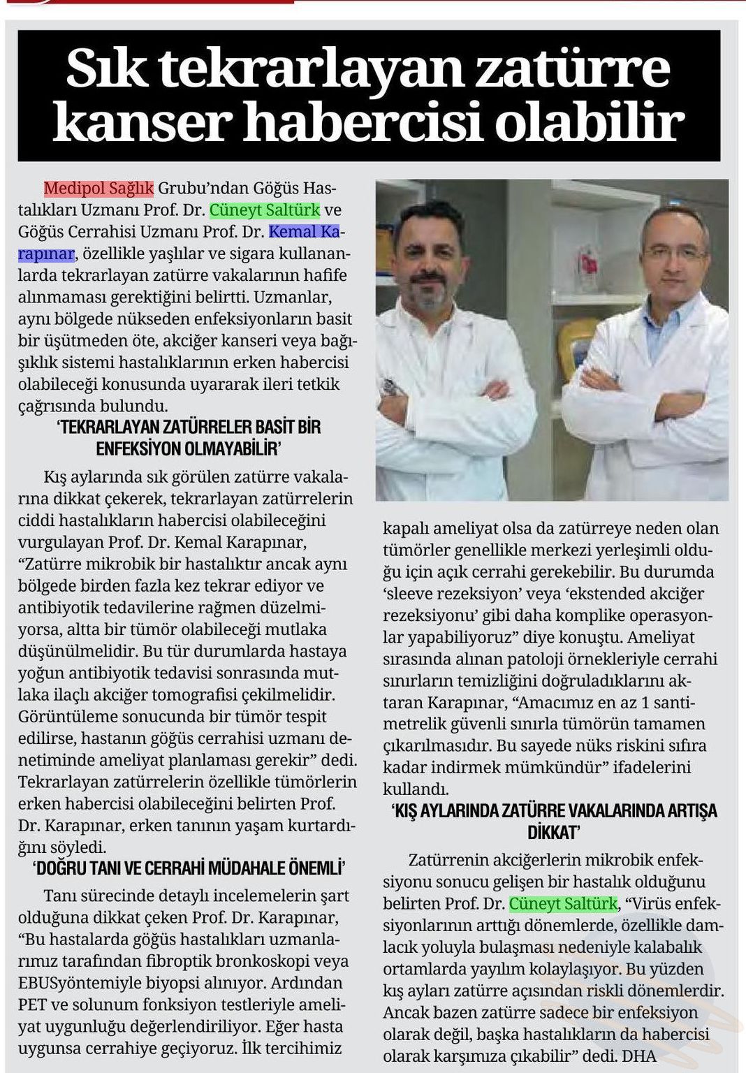 Kış aylarında sık görülen zatürre vakalarına dikkat çekerek, tekrarlayan zatürrelerin ciddi hastalıkların habercisi olabileceğini vurgulayan Prof. Dr. Karapınar, “Zatürre mikrobik bir hastalıktır ancak aynı bölgede birden fazla kez tekrar ediyor ve antibiyotik tedavilerine rağmen düzelmiyorsa, altta bir tümör olabileceği mutlaka düşünülmelidir. Bu tür durumlarda hastaya yoğun antibiyotik tedavisi sonrasında mutlaka ilaçlı akciğer tomografisi çekilmelidir. Görüntüleme sonucunda bir tümör tespit edilirse, hastanın göğüs cerrahisi uzmanı denetiminde ameliyat planlaması gerekir” dedi. Tekrarlayan zatürrelerin özellikle tümörlerin erken habercisi olabileceğini belirten Prof. Dr. Karapınar, erken tanının yaşam kurtardığını söyledi.