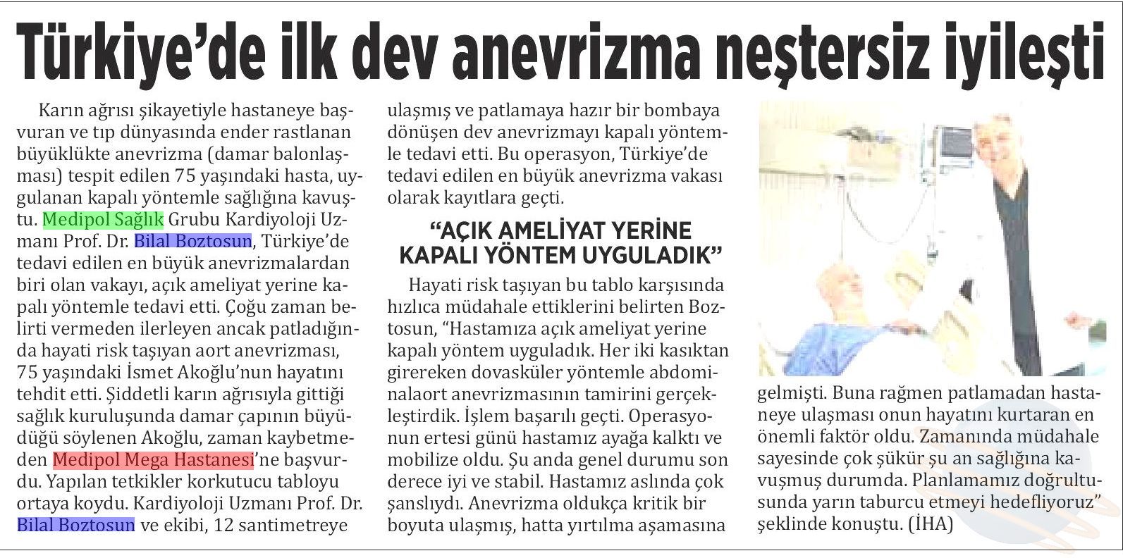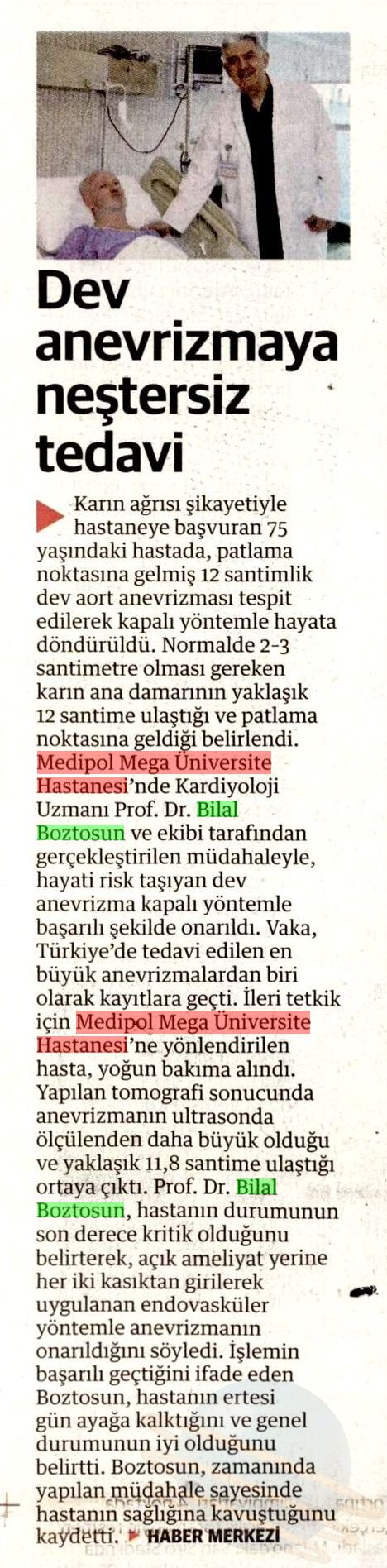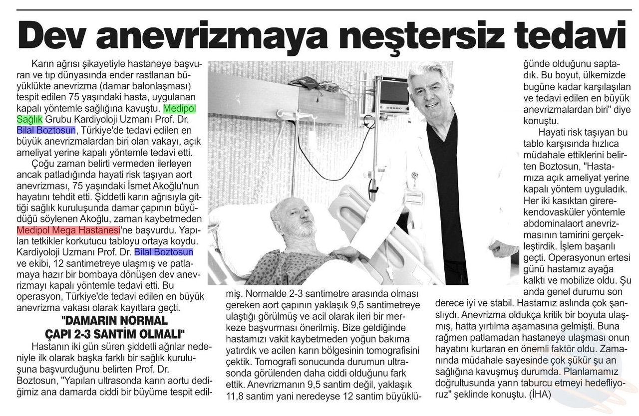 Karın ağrısı şikayetiyle hastaneye başvuran 75 yaşındaki İsmet Akoğlu’nda, tıp dünyasında ender rastlanan büyüklükte bir anevrizma (damar balonlaşması) tespit edildi. Normalde 2 santim olması gereken karın ana damarının 12 santime ulaşarak patlama noktasına geldiği belirlendi. Medipol Sağlık Grubu Kardiyoloji Uzmanı Prof. Dr. Bilal Boztosun, Türkiye’de tedavi edilen en büyük anevrizmalardan biri olan bu vakayı, açık ameliyat yerine kapalı yöntemle onardı.