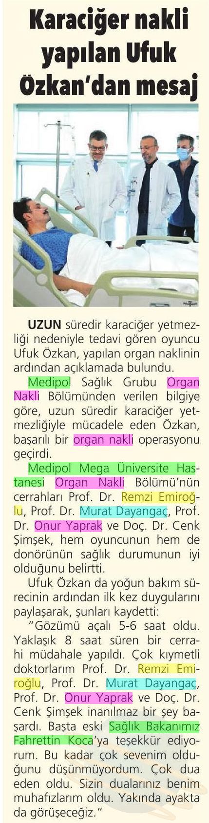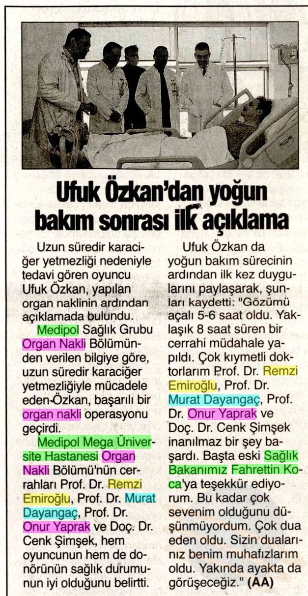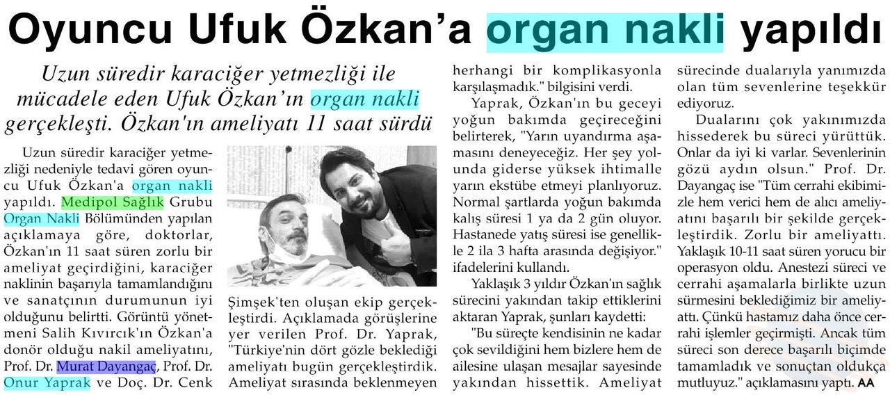 Öte yandan, önümüzdeki günlerde Ufuk Özkan ve donörü ile birlikte ameliyatı gerçekleştiren hekimlerin katılımıyla kamuoyunu bilgilendirmek için bir basın toplantısı da gerçekleştirilecek.