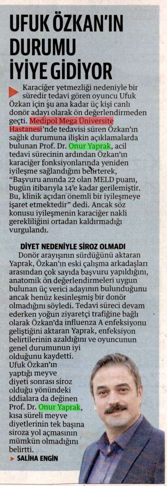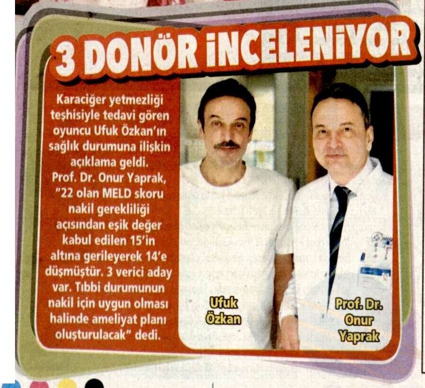 Prof. Dr. Yaprak açıklamalarını şu sözlerle tamamladı: “Donör arayışı devam ederken, hastamız Ufuk Özkan’ın sağlık durumunda da önemli gelişmeler kaydedilmiştir. Karaciğer yetmezliği tablosunda yeniden iyileşme sağlanmış, 22 olan MELD skoru nakil gerekliliği açısından eşik değer kabul edilen 15’in altına gerileyerek 14’e düşmüştür. Ancak bu klinik iyileşme, hastamızın uygun koşullar oluştuğunda karaciğer nakli yapılması gerektiği gerçeğini değiştirmemektedir. Yoğun ziyaretçi trafiğine bağlı olarak influenza A enfeksiyonu gelişmiş olup, enfeksiyona ait semptomlar giderek azalmaktadır. Hastamızın genel durumu iyi olup izlem ve tedavisine devam edilmektedir.”