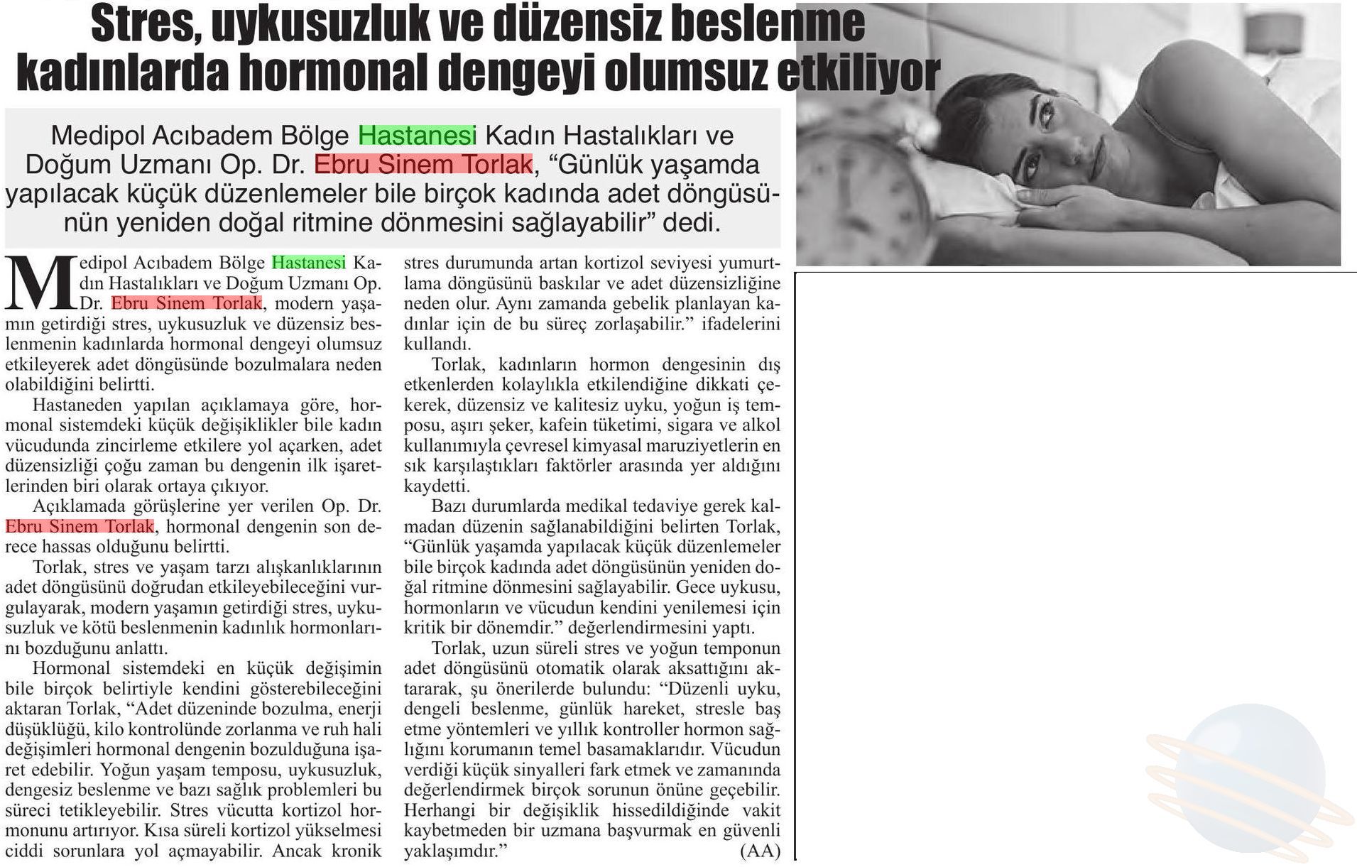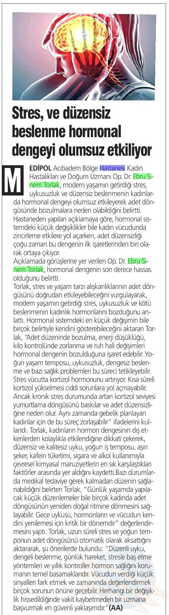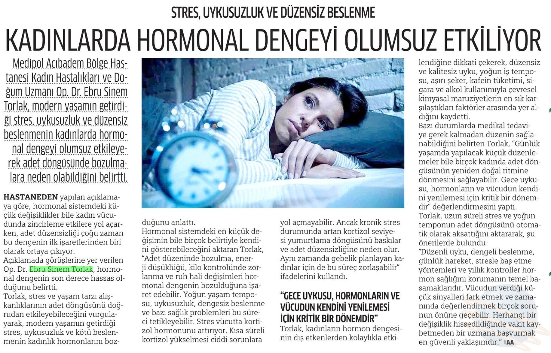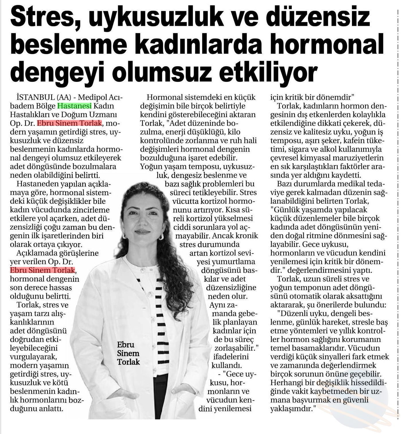 Uzun süreli stres ve yoğun temponun adet döngüsünü otomatik olarak aksattığını vurgulayan Op. Dr. Ebru Sinem Torlak, “Düzenli uyku, dengeli beslenme, günlük hareket, stresle baş etme yöntemleri ve yıllık kontroller hormon sağlığını korumanın temel basamaklarıdır. Vücudun verdiği küçük sinyalleri fark etmek ve zamanında değerlendirmek birçok sorunun önüne geçebilir. Herhangi bir değişiklik hissedildiğinde vakit kaybetmeden bir uzmana başvurmak en güvenli yaklaşımdır” şeklinde konuştu.