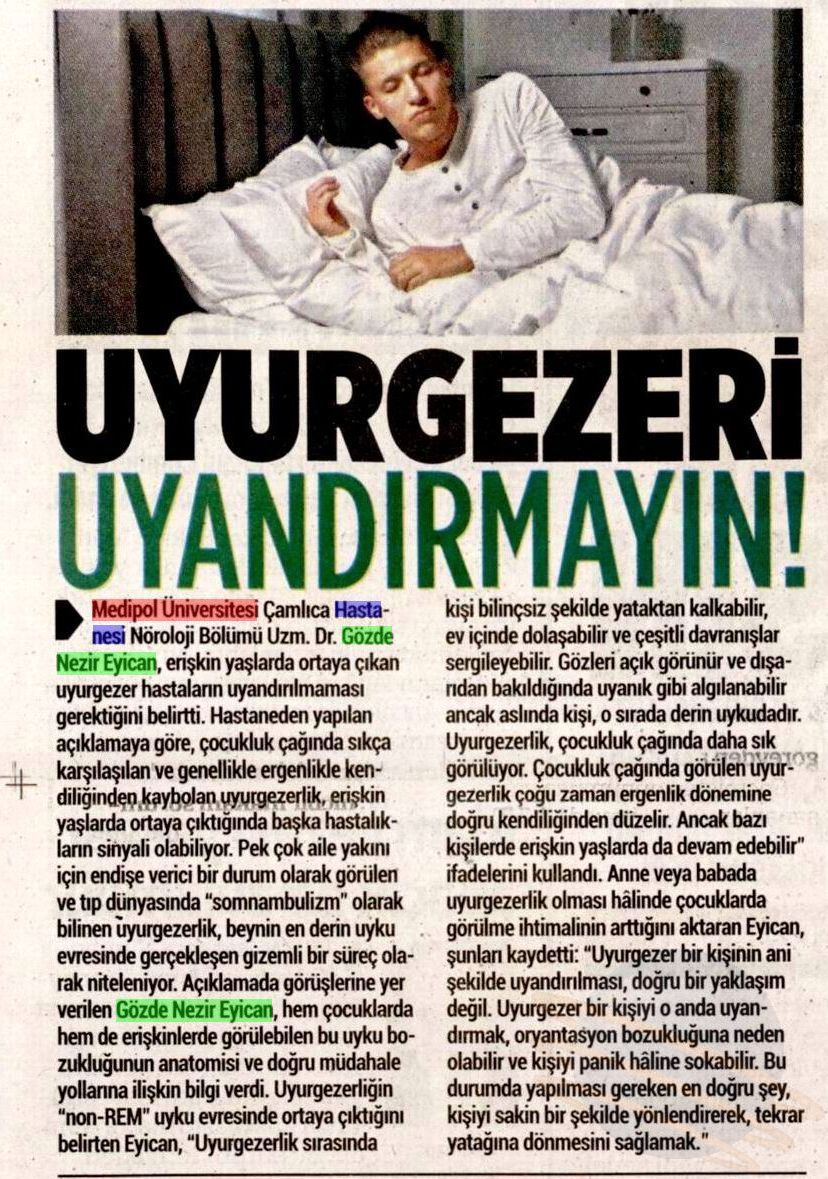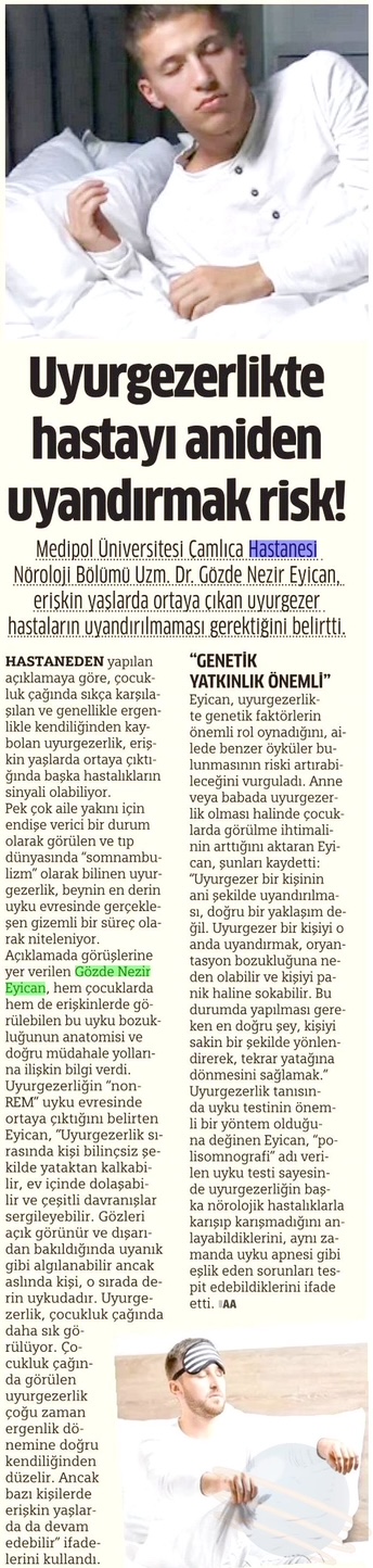 Erişkin yaşlarda ortaya çıkan uyurgezerliğin bazı hastalıklarla birlikte görülebileceğini belirten Dr. Eyican, “Uyurgezerlik erişkinlerde uyku apnesi, huzursuz bacaklar sendromu, bazı psikiyatrik hastalıklar veya nörolojik rahatsızlıklarla birlikte görülebilir. Bu nedenle erişkinlerde mutlaka tanı ve tedavi planı yapılmalıdır. Uyurgezerlik sırasında kişi farkında olmadan kendisine veya çevresindekilere zarar verebilir. Bu nedenle kesici ve delici aletlerin bulunduğu alanların kilitlenmesi, kapı ve pencerelere güvenlik kilidi takılması gibi önlemler alınmalıdır”