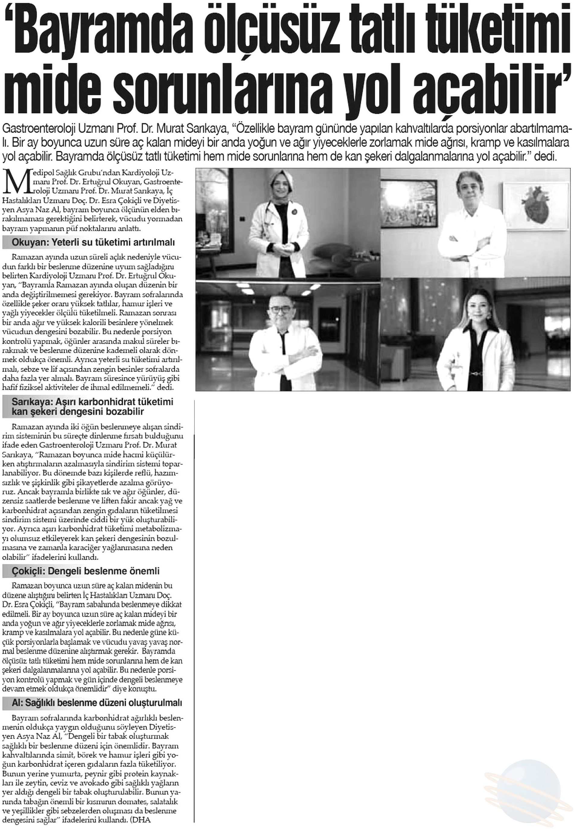 Bir ay boyunca iki öğün beslenmeye alışan vücut, Ramazan Bayramı ile birlikte yeniden değişen beslenme düzenine geçiyor. Uzmanlar ise bu geçiş döneminde yapılan ani ve yoğun yemek tüketiminin sağlık sorunlarına yol açabileceğini belirtiyor. Medipol Sağlık Grubu’ndan Kardiyoloji Uzmanı Prof. Dr. Ertuğrul Okuyan, Gastroenteroloji Uzmanı Prof. Dr. Murat Sarıkaya, İç Hastalıkları Uzmanı Doç. Dr. Esra Çokiçli ve Diyetisyen Asya Naz Al, bayram boyunca ölçünün elden bırakılmaması gerektiğini hatırlatarak, vücudu yormadan bayram yapmanın püf noktalarını anlattı.