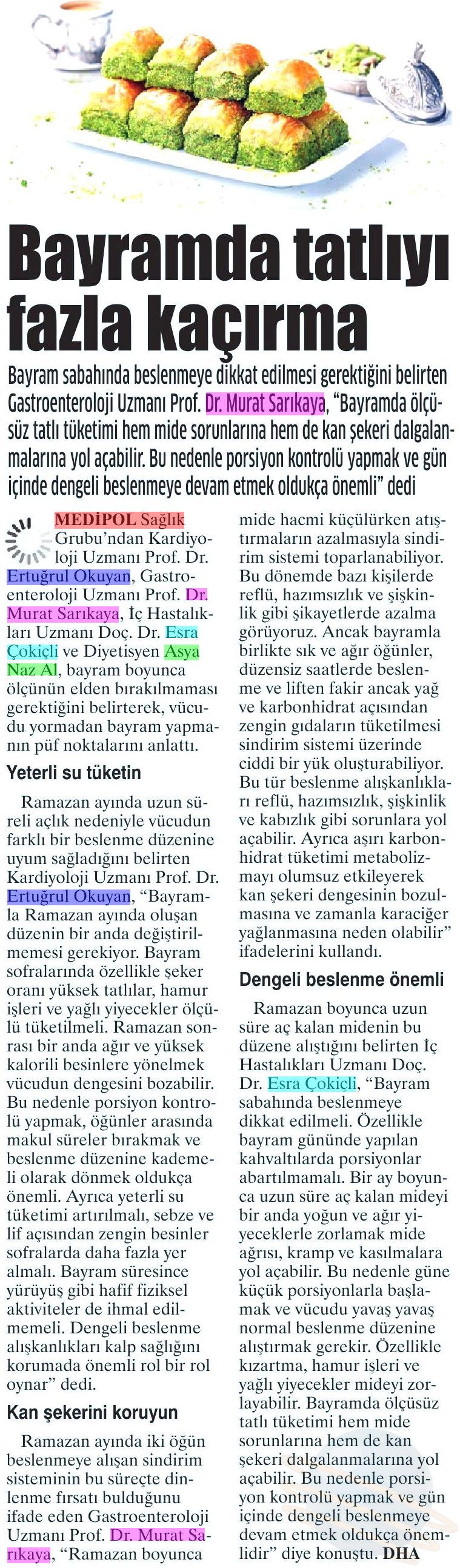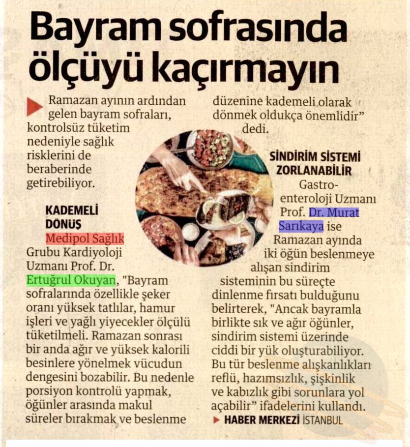 Ramazan boyunca uzun süre aç kalan midenin bu düzene alıştığını belirten Doç. Çokiçli, “Bayram sabahında beslenmeye dikkat edilmeli. Özellikle bayram gününde yapılan kahvaltılarda porsiyonlar abartılmamalı. Bir ay boyunca uzun süre aç kalan mideyi bir anda yoğun ve ağır yiyeceklerle zorlamak mide ağrısı, kramp ve kasılmalara yol açabilir. Bu nedenle güne küçük porsiyonlarla başlamak ve vücudu yavaş yavaş normal beslenme düzenine alıştırmak gerekir. Özellikle kızartma, hamur işleri ve yağlı yiyecekler mideyi zorlayabilir. Bayramda ölçüsüz tatlı tüketimi hem mide sorunlarına hem de kan şekeri dalgalanmalarına yol açabilir. Bu nedenle porsiyon kontrolü yapmak ve gün içinde dengeli beslenmeye devam etmek oldukça önemlidir” diye konuştu.