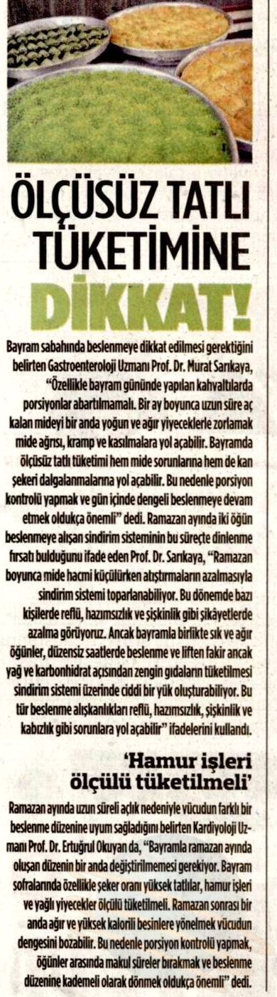 Ramazan ayında iki öğün beslenmeye alışan sindirim sisteminin bu süreçte dinlenme fırsatı bulduğunu ifade eden Prof. Sarıkaya, “Ramazan boyunca mide hacmi küçülürken atıştırmaların azalmasıyla birlikte sindirim sistemi toparlanabiliyor. Bu dönemde bazı kişilerde reflü, hazımsızlık ve şişkinlik gibi şikâyetlerde azalma görüyoruz. Ancak bayramla birlikte sık ve ağır öğünler, düzensiz saatlerde beslenme ve liften fakir ancak yağ ve karbonhidrat açısından zengin gıdaların tüketilmesi sindirim sistemi üzerinde ciddi bir yük oluşturabiliyor. Bu tür beslenme alışkanlıkları reflü, hazımsızlık, şişkinlik ve kabızlık gibi sorunlara yol açabilir. Ayrıca aşırı karbonhidrat tüketimi metabolizmayı olumsuz etkileyerek kan şekeri dengesinin bozulmasına ve zamanla karaciğer yağlanmasına neden olabilir” ifadelerini kullandı.