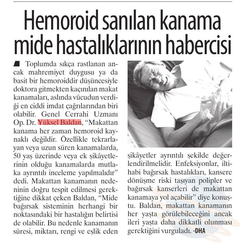 Makattan kanamanın nedeninin doğru tespit edilmesi gerektiğine dikkat çeken Dr. Yüksel Baldan, “Makattan kanama, hemoroid ya da anal fissür gibi makat hastalıklarından kaynaklanabileceği gibi, mide bağırsak sisteminin herhangi bir noktasındaki bir hastalığın belirtisi de olabilir. Bu nedenle kanamanın süresi, miktarı, rengi ve eşlik eden şikâyetler ayrıntılı şekilde değerlendirilmelidir. Enfeksiyonlar, iltihabi bağırsak hastalıkları, kansere dönüşme riski taşıyan polipler ve bağırsak kanserleri de makattan kanamaya yol açabilir. Her hastalığın tedavisi farklıdır. Bu yüzden doğru tanı hayati önem taşır” diye konuştu.