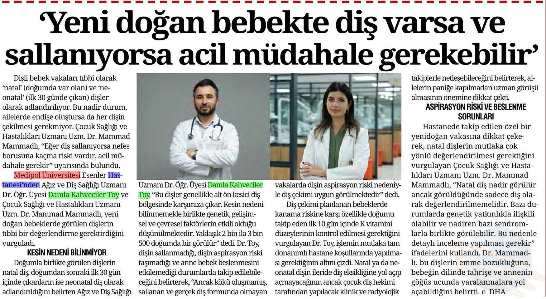 Doğumhane kapısında beklenen bebek ağlamasına bazen beklenmedik bir sürpriz eşlik edebiliyor. Yeni doğmuş bebeğiniz ağzında bir dişle doğabilir. Yaklaşık 2 bin ila 3 bin doğumda bir görülen bu nadir durum, ailelerde büyük bir şaşkınlık ve endişe oluşturuyor. Medipol Üniversitesi Esenler Hastanesi’nden Ağız ve Diş Sağlığı Uzmanı Dr. Öğr. Üyesi Damla Kahveciler Toy ve Çocuk Sağlığı ve Hastalıkları Uzmanı Uzm. Dr. Mammad Mammadlı, bu dişlerin tıbbi bir değerlendirme gerektirdiğini vurguladı.