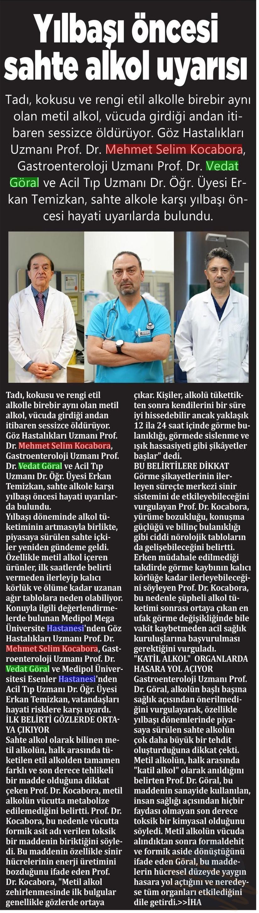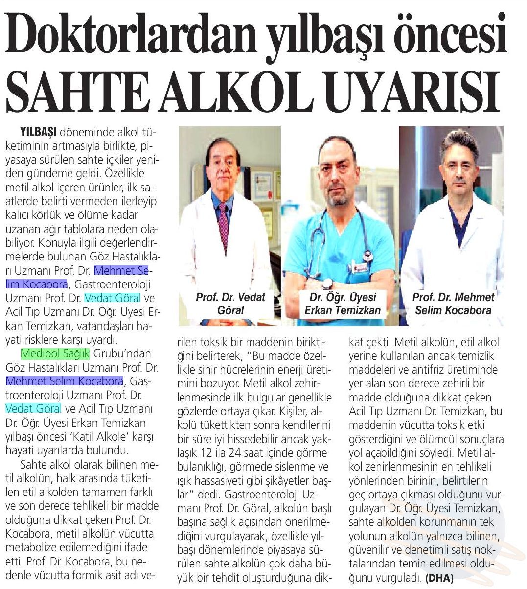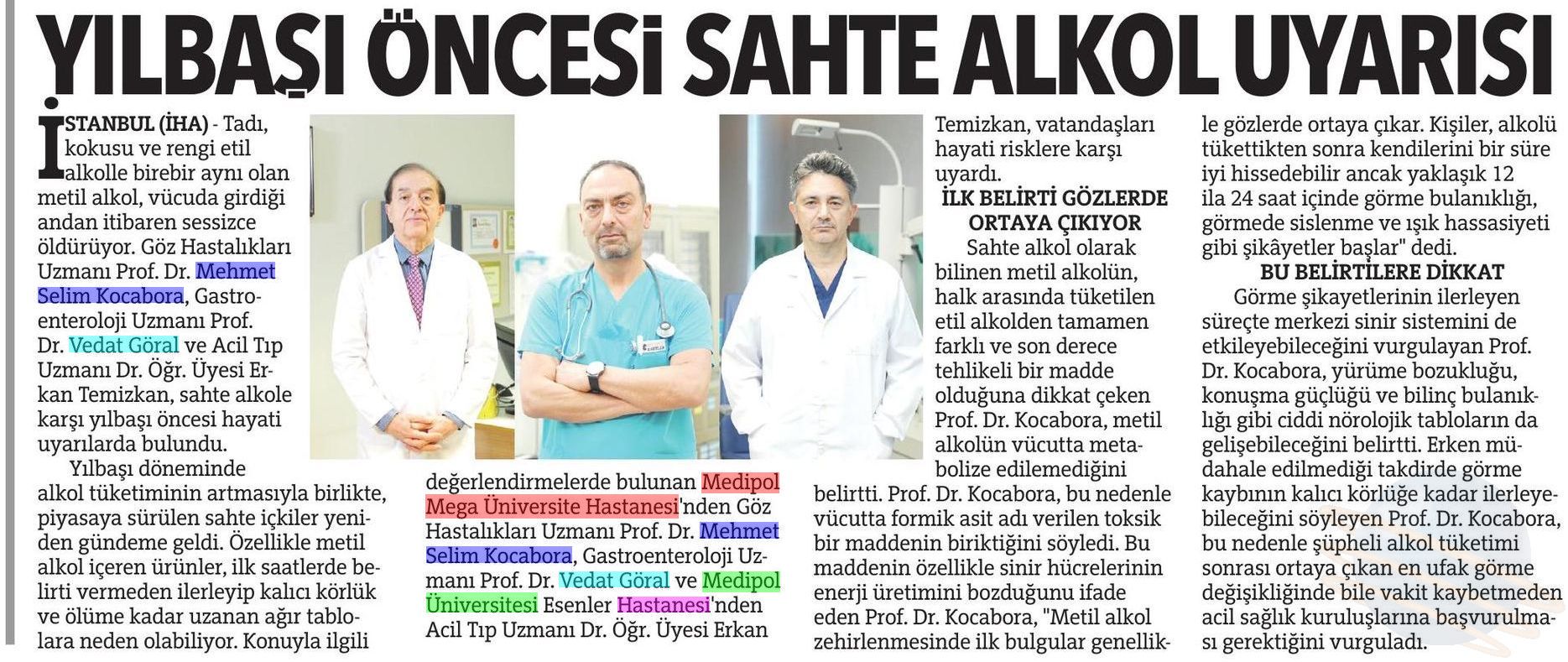 Yılbaşı döneminde alkol tüketiminin artmasıyla birlikte, piyasaya sürülen sahte içkiler yeniden gündeme geldi. Özellikle metil alkol içeren ürünler, ilk saatlerde belirti vermeden ilerleyip kalıcı körlük ve ölüme kadar uzanan ağır tablolara neden olabiliyor. Konuyla ilgili değerlendirmelerde bulunan Medipol Mega Üniversite Hastanesi’nden Göz Hastalıkları Uzmanı Prof. Dr. Mehmet Selim Kocabora, Gastroenteroloji Uzmanı Prof. Dr. Vedat Göral ve Medipol Üniversitesi Esenler Hastanesi’nden Acil Tıp Uzmanı Dr. Öğr. Üyesi Erkan Temizkan, vatandaşları hayati risklere karşı uyardı.
