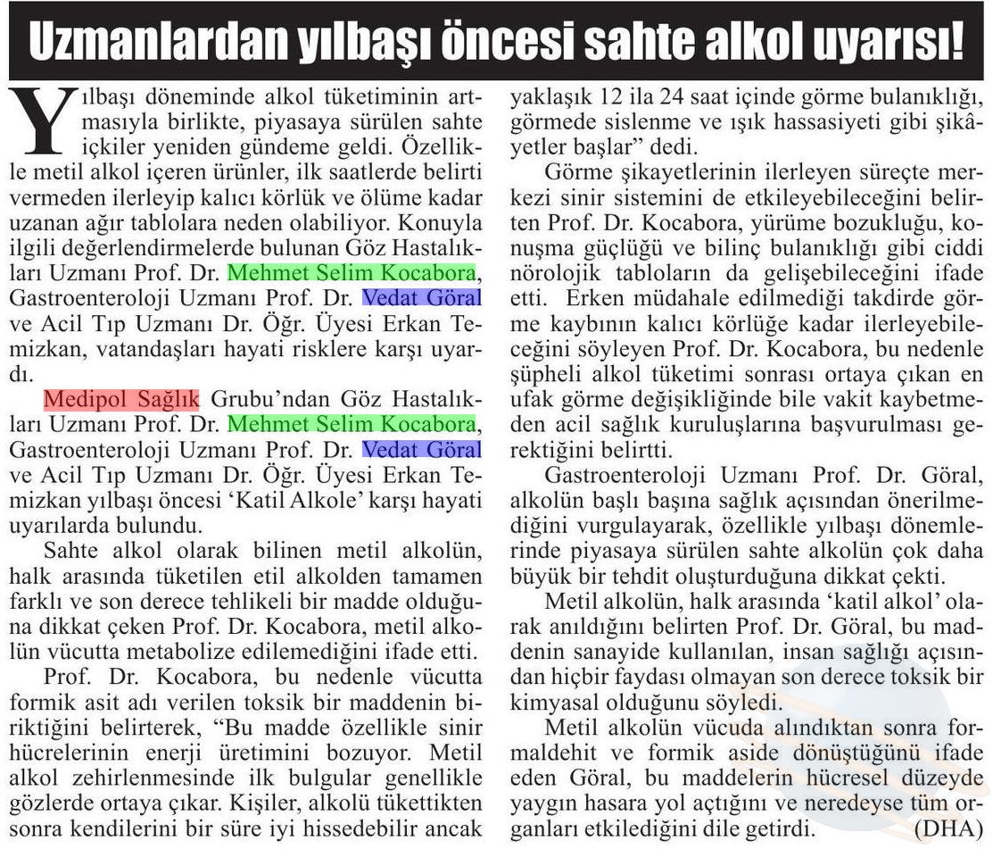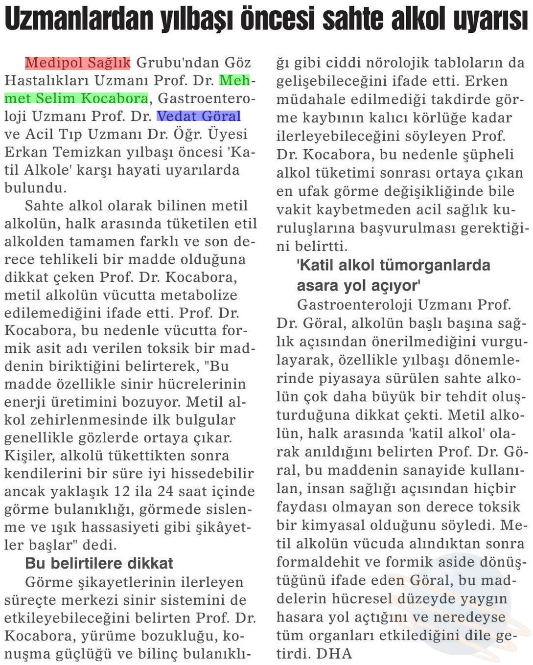 Yılbaşı eğlenceniz faciaya dönüşmesin. Tadı, kokusu ve rengi gerçeğiyle birebir aynı olan Metil Alkol, vücuda girdiği andan itibaren sessizce öldürüyor. Medipol Sağlık Grubu’ndan Göz Hastalıkları Uzmanı Prof. Dr. Mehmet Selim Kocabora, Gastroenteroloji Uzmanı Prof. Dr. Vedat Göral ve Acil Tıp Uzmanı Dr. Öğr. Üyesi Erkan Temizkan Katil Alkole karşı hayati uyarılarda bulundu.